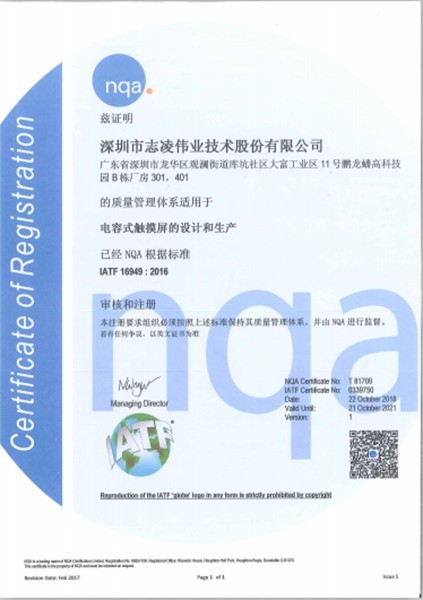 ? ? ? ?歷經一段時間的沉淀與改進,近日,國內電容觸控解決方案服務商——志凌偉業已通過IATF 16949